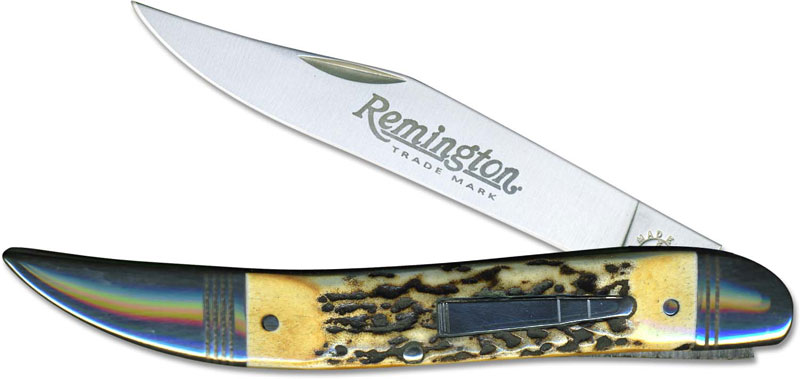 The R1613 (R11043) 2017 Remington Bullet Knife is The Powderhorn that features a clip point blade made of 440 stainless steel, .07" thick, with a Rockwell hardness of 56-59. The blade has a satin finish, the Remington Trade Mark etch, Remington UMC Made in the USA tang stamp, and a nail nick for opening. The genuine India Stag handle, 5" closed, has brass liners, nickel silver pins, grooved and polished nickel silver bolsters, and nickel silver Bullet shield. The Powder Horn with Stag handle weighs 3.5 ounces. Includes Certificate of Authenticity. Limited to 1200 pieces, made in the USA.