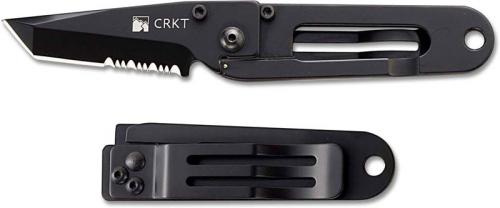 The illustrated CRKT Knife is the Black CRKT K.I.S.S. Knife, designed by Ed Halligan, that features a 2.25" part serrated tanto blade made of 3Cr13 stainless steel, .12" thick. The blade of this CRKT knife has a non reflective black coat and a thumb stud for one hand opening. The black skeletonized stainless steel handle, 3.5" closed, has a frame lock and a lanyard hole. A metal pocket clip is mounted at the pivot end of this CRKT knife. The Black CRKT K.I.S.S. Knife with part serrated blade weighs 2.2 ounces.