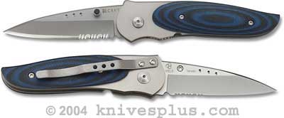 The illustrated CRKT Knife is the Large CRKT Wasp Knife, designed by Howard Viele, that features a 3.13" part serrated blade made of AUS118 stainless steel. The blade of this CRKT knife has a frost finish and a thumb stud for one hand opening. The silvery gray titanium handle, 4.38" closed, has a liner lock. A metal pocket clip is included with this CRKT knife. The Large CRKT Wasp Knife with part serrated blade weighs 3.4 ounces.
