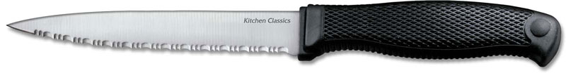 The illustrated Cold Steel Knife is the Kitchen Classics Cold Steel Steak Knife that features a 4 5/8" serrated blade made of German 4116 stainless steel, 1.5mm thick. The Kray-Ex handle of this Cold Steel Knife has texturing for secure, non slip grip. The Cold Steel Steak Knife has an overall length of 8 5/8", and it weighs 1.3 ounces.