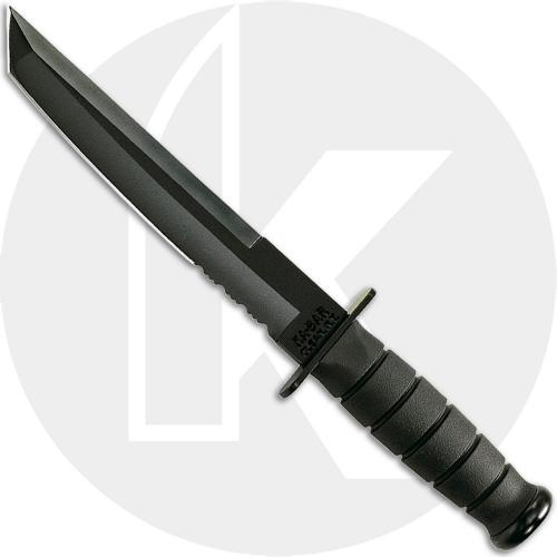 The illustrated KABAR knife is the KA-BAR Tanto Knife that features an 8" part serrated 1095 Cro-Van high carbon steel tanto blade with epoxy powder coat. Oval Kraton G thermoplastic elastomer handle with powdered metal butt cap and carbon steel guard (butt cap and guard are powder coated). A hard plastic sheath is included with this KABAR Knife. The KABAR Tanto Knife has an overall length of 12 7/8", and it weighs .75 pounds.