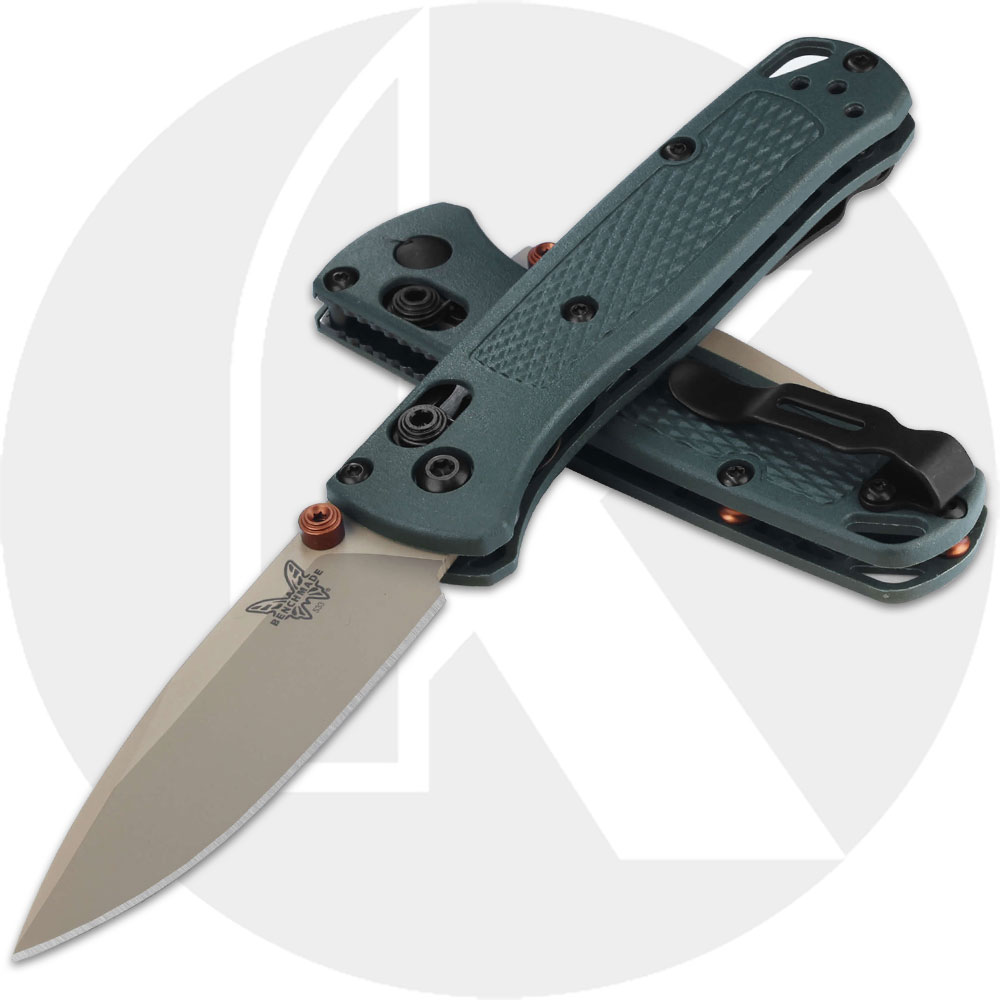 The 533TN-2601 Benchmade Mini Bugout is a scaled down version of the fiendishly popular Bugout EDC that features a 2.82-inch drop point blade made of Elmax stainless steel, .09-inch thick, with a Rockwell hardness of 58-60. The blade has a tan cerakote finish, a top swedge to lessen weight and dual burnt copper anodized thumb studs for ambidextrous one hand opening. The slim Taiga Green Grivory handle, 3.70-inches closed, has checkered texturing for secure grip, sturdy AXIS Lock, a lanyard hole and a side to side reversible deep carry mini clip mounted at the butt end. The Benchmade Mini Bugout has an overall open length of 6.49-inches, and it weighs 1.5 ounces. Proudly made in the USA.