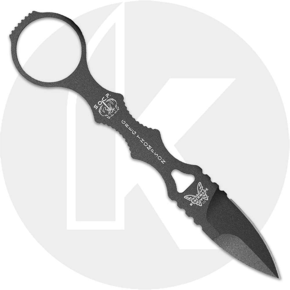 The 177GY Benchmade Mini SOCP (Special Operations Combatives Program) Knife, designed by Greg Thompson, features single piece 440C stainless steel construction with an all over non reflective Tungsten Gray cerakote finish, and a Rockwell hardness of 58-60. The Mini SOCP has a 1.66-inch spear point blade area, .175-inch thick; a skeletonized handle area with Greg Thompson SOCP logo embellishment, notched finger grooves for secure grip, and a notched finger ring pommel for deployment. A MOLLE compatible injection molded plastic sheath is included. The Benchmade Mini SOCP Knife has an overall length of 6.3-inches, and it weighs 1.81 ounces. Made in the USA.