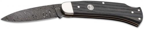 The Limited Edition Boker Fellow Classic Damascus Knife features a 3 1/4" drop point blade made of ripple pattern Damascus, hand forged by Chad Nichols. The beautifully patterned old growth bog oak handle, 4 1/4" closed, has a single nickel silver bolster, inlaid Tree shield and a lockback. The Fellow Classic Damascus has an overall open length of 7 1/2", and it weighs 3.7 ounces. Limited to 500 serial numbered pieces worldwide; made in Germany.