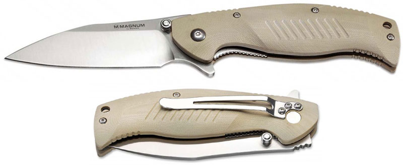 The Boker Magnum Delta Whiskey Knife is a versatile everyday carry that features a 3.5" modified drop point blade made of 440B stainless steel, .10" thick, with satin finish, dual thumb studs and a flipper for ambidextrous one hand opening. The beige G10 handle, 4.8" closed, has ergonomic contours, milled grooves and notches for secure grip, stainless steel liners for strength, a liner lock, lanyard hole and a metal pocket clip mounted at the pivot end. The Magnum Delta Whiskey Knife has an overall open length of 8.3", and it weighs 5.7 ounces. Made in China.