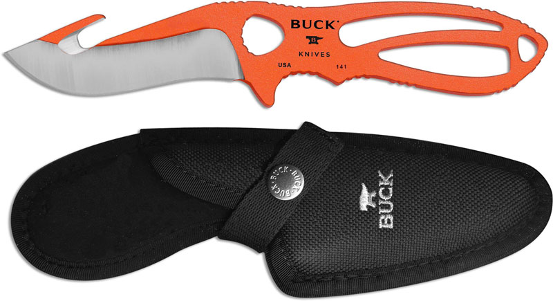 The illustrated Buck Knife is the Large Buck PakLite Gut Hook Skinner Knife that features single piece 420HC stainless steel construction, .180" thick, with Neon Orange Traction Coating for secure grip. The Large PakLite Gut Hook Skinner Knife has a 3 1/2" gut hook blade area with notched thumb rest; a skeletonized handle area with texture notches for secure purchase, and a lanyard hole. A heavy duty black polyester sheath is included with this Buck Knife. The Large Buck PakLite Gut Hook Skinner Knife has an overall length of 8", and it weighs 4.1 ounces. Made in the USA.