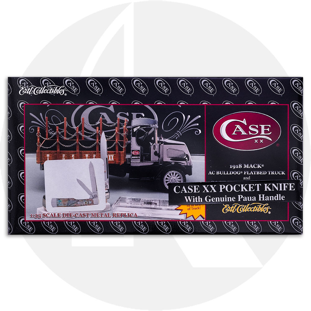 Introducing the Case 01891 2003 ERTL Truck. This genuine Case collectable is a Ninth Edition 1918 Mack AC Bulldog Flatbed Truck and comes with a Gunstock knife. The black anodized Mack AC Bulldog Truck is a 1:33rd scale die-cast metal replica featuring Case XX logos on the doors and bed stakes. The Gunstock Knife (8215SS), 2 7/8-inches closed, features spear and pen blades made of Tru-Sharp surgical steel with the Case "Long Tailed C" serial number on a bolster and a genuine Paua handle with a Case Oval inlay shield. Discontinued item, BNIB; made in the USA in 2003.