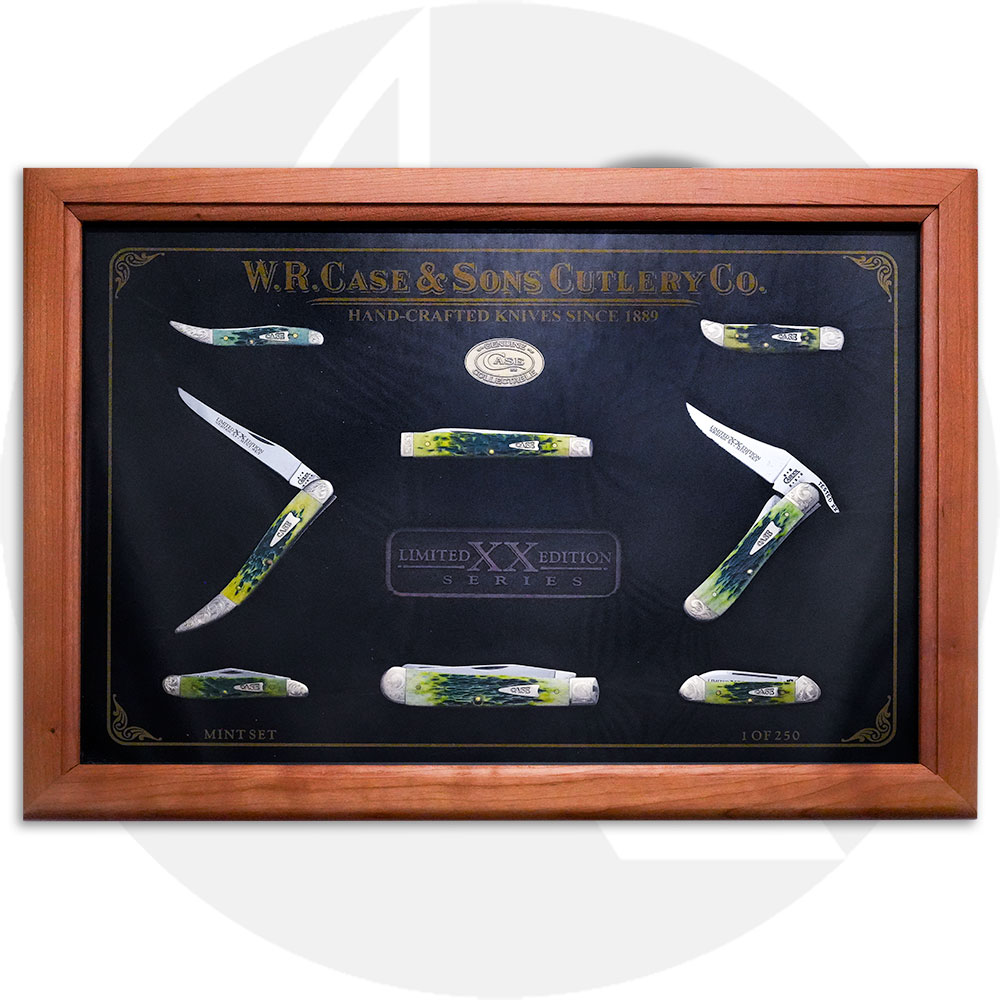 This Limited Edition XI Mint Set showcases the Jigged Green Apple Bone handle on a variety of patterns - a 6220SS Peanut, a 610096SS Small Texas Toothpick, a 62132SS Baby Butterbean, a 610094SS Medium Texas Toothpick, a TH62165SS Pocket Hunter, a 6254SS Trapper, a 61953LSS RussLock, and a 6185SS Doctor. Each knife features scrolled bolsters and Limited Edition etchings on one of the blades. This set comes in a wooden display case with a glass top with a Certificate of Authenticity in a sleeve on the back.