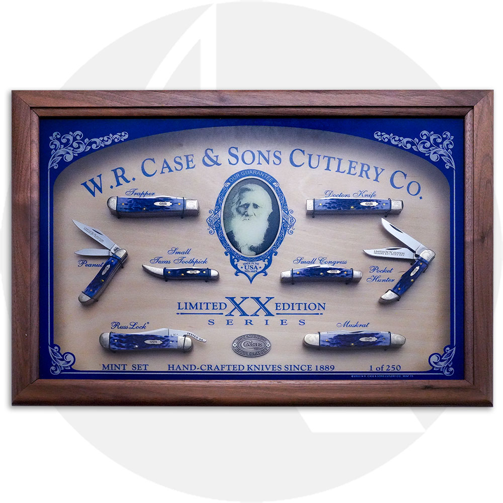 This Limited Edition XV Mint Set showcases the Jigged Ultra Violet Bone handle on a variety of patterns - a 6207SS Mini Trapper, a 6468SS Small Congress, a 610096SS Small Texas Toothpick, a 6220SS Peanut, a TH62165SS Pocket Hunter, a MuskratSS, a 6185SS Doctor, and a 61953LSS RussLock. Each knife features scrolled bolsters and Limited Edition etchings on one of the blades. This set comes in a wooden display case with a glass top with a Certificate of Authenticity in a sleeve on the back.