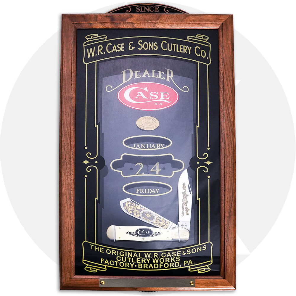 This 2004 Dealer Knife features a Large Coke Bottle knife with Tru-Sharp surgical stainless steel blades with Case Dealer embellishments and a Smooth Natural Bone handle. The commemorative wooden display functions as a calendar with manual wheels on either side which allow the user to adjust the month, day, and weekday. The case also includes a Genuine Collectable Medallion.