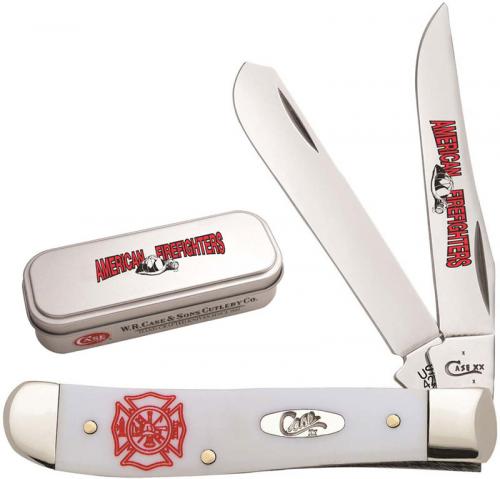 The Case Fire Fighter (4207SS) Mini Trapper Knife features an embellished clip blade and a spey blade made of Tru-Sharp surgical stainless steel with nail nicks for opening. The Smooth White Synthetic handle, 3 1/2" closed, has the Case Oval Script shield, Fire Fighter logo embellishment and nickel silver bolsters. The Case Mini Trapper Knife weighs 2.7 ounces. Made in the USA; packaged in a Fire Fighter gift tin.
