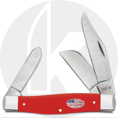 The 73929 Case American Workman Synthetic Red (6375SS) Large Stockman Knife features clip, sheepfoot and spey blades made of tough carbon steel with nail nicks for opening. The red synthetic handle, 4 1/4 inches closed, has the Case Oval Nickel Silver Stars & Stripes Inlay shield and nickel silver bolsters. The Case Large Stockman Knife weighs 4.1 ounces. Made in the USA.