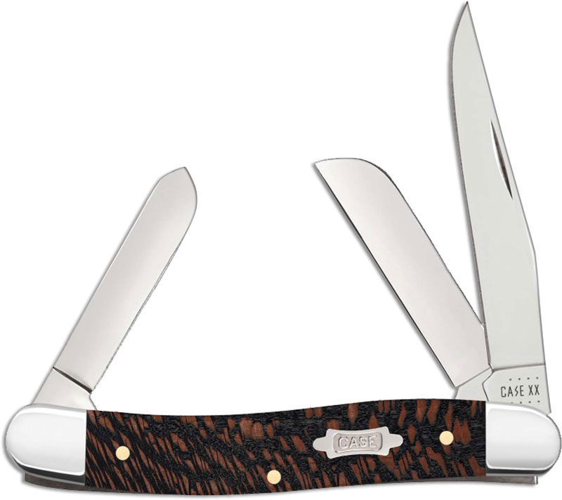 The 25573 Case Black Sycamore Wood (7318SS) Medium Stockman Knife features clip, spey and sheepfoot blades made of mirror polished Tru-Sharp Surgical Steel with nail nicks for opening. The genuine Black Sycamore Wood handle, 3 5/8 inches closed, has the Case Bowtie shield and nickel silver bolsters. This Case Medium Stockman Knife weighs 2.5 ounces. Made in the USA.