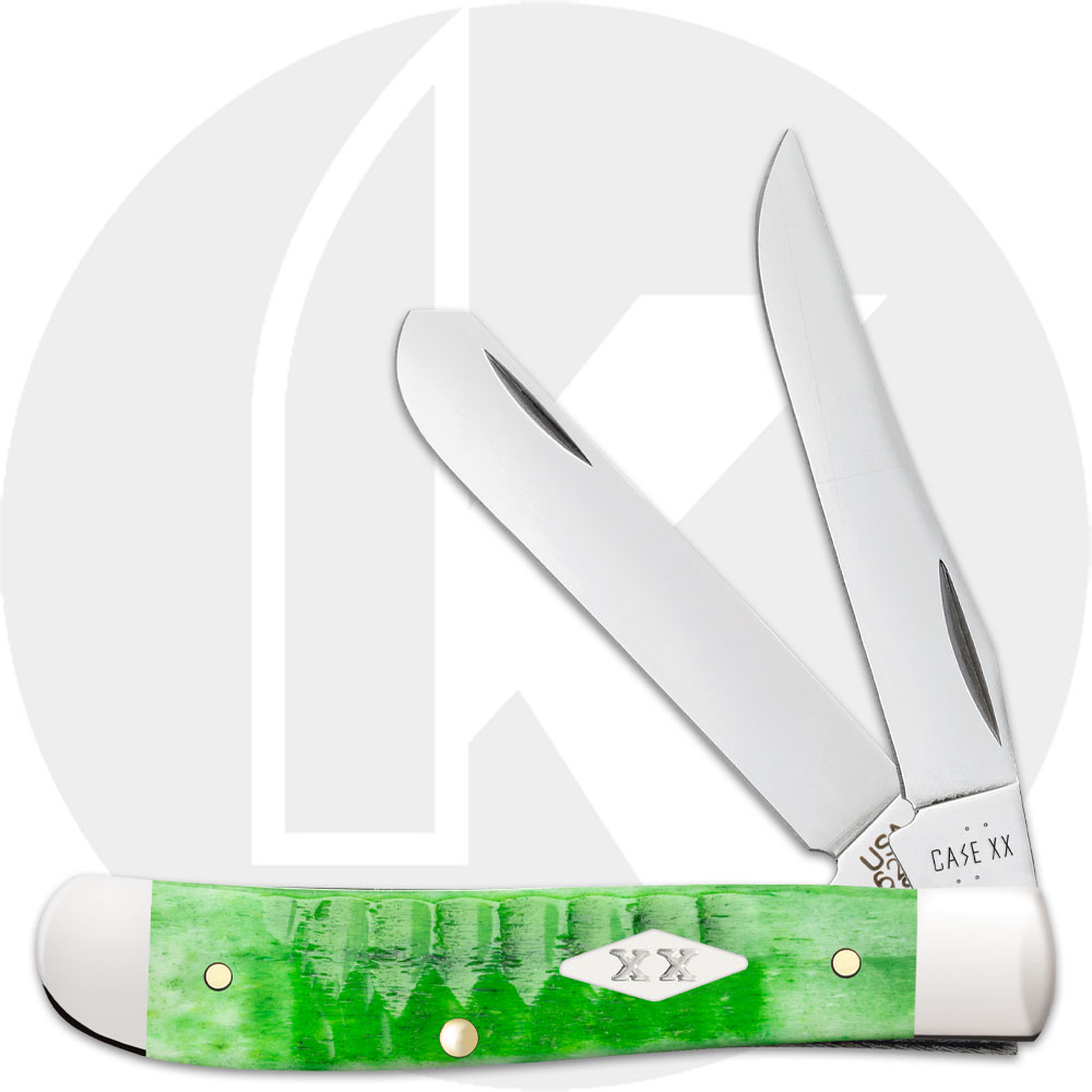 The Case 11441 Bright Green Bone (6207SS) Mini Trapper Knife features clip and spey blades made of Tru-Sharp Surgical steel with nail nicks for opening. The Gator Jig Bright Green Bone handle of this Case knife, 3 1/2 inches closed, has the Case Nickel Silver Diamond XX inlay shield and pinched nickel silver bolsters. The Case Mini Trapper Knife weighs 2.7 ounces. Made in the USA.