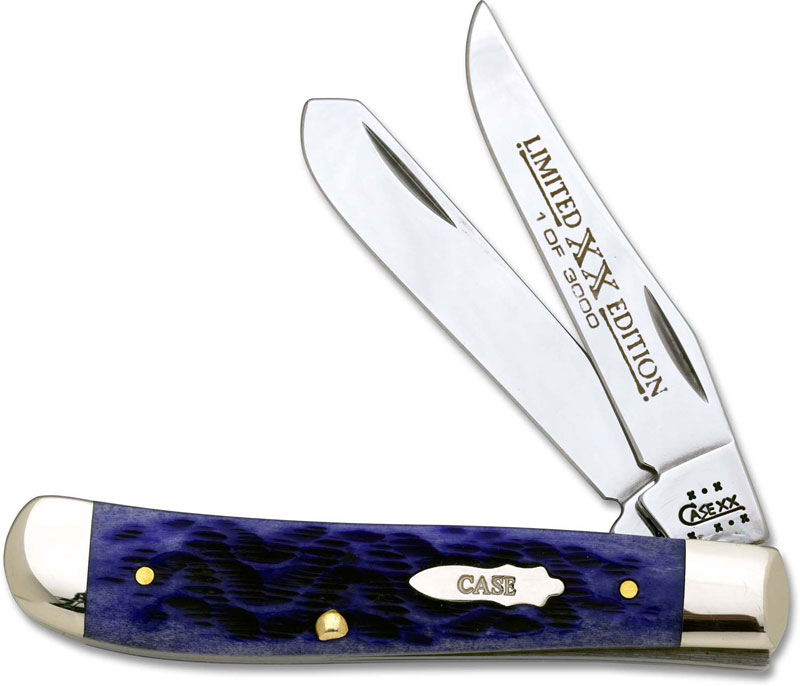 The 15070 Case Limited Edition XV (6207SS) Mini Trapper Knife features a clip blade with Limited XX Edition 1 of 3000 embellishment and a spey blade made of mirror polished Tru-Sharp Surgical steel, with nail nicks for opening. The Peach Seed Jig Ultra Violet Bone handle, 3 1/2 inches closed, has the Case Bomb Shield and nickel silver bolsters. The Case Mini Trapper Knife weighs 2.7 ounces.