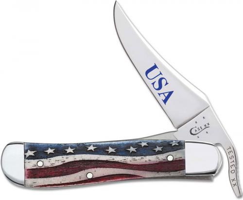 The Case Star Spangled Smooth Natural Bone (61953LSS) RussLock Knife features a locking clip blade with USA embellishment made of Tru-Sharp surgical stainless steel with a jimped lever for one hand opening. The Smooth Natural Bone handle, 4 1/4" closed, has Star Spangled Patriotic mark side detailing, nickel silver bolsters and a liner lock. The Case RussLock Knife weighs 2.7 ounces. Made in the USA.