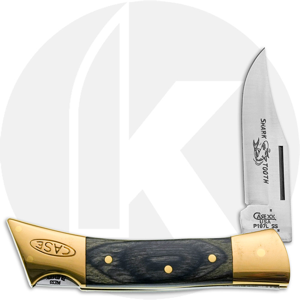 Introducing the Case 00250 (P197LSS) Shark Tooth Knife. This knife features a locking clip blade made of Tru-Sharp surgical steel with a glazed finish and a french nail nick for opening. The handle, 5-inches closed, is Black Laminated Pakkawood with a lockback and brass bolsters. The Case Shark Toothknife weighs 7.3 ounces and comes with a leather sheath. Discontinued item, BNIB; made in the USA in 2008.