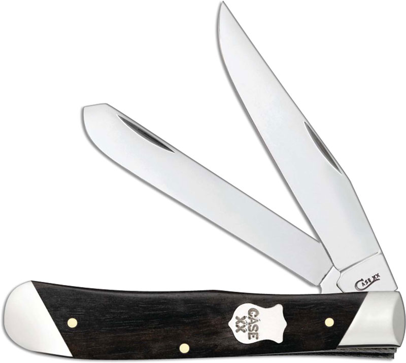 The Case Ebony Wood (7254SS) Trapper features clip and spey blades made of Tru-Sharp surgical stainless steel with nail nicks for opening. The Smooth Dark Ebony Wood handle, 4 1/8 inches closed, has the Case XX Badge shield and unusual slanted nickel silver bolsters. The Case Trapper Knife weighs 4.0 ounces. Made in the USA.