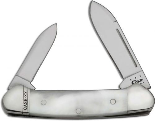 The illustrated Case Knife is the Mother of Pearl (82132SS) Case Baby Butterbean Knife that features spear and pen blades made of Tru-Sharp surgical steel with nail nicks for opening. The genuine Mother of Pearl handle of this Case knife, 2 3/4" closed, has nickel silver pins and nickel silver bolsters. The cap end bolster of this Case knife has CASE XX laser engraving. The Case Baby Butterbean Knife with genuine Mother of Pearl handle weighs 1.5 ounces. Made in the USA.