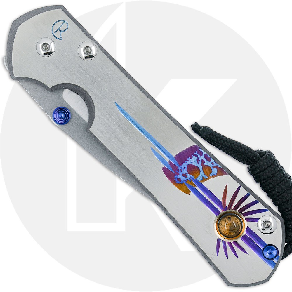 The L31-1408-0264 Chris Reeve Large Sebenza 31 features a 3.61-inch drop point blade made of premium CPM MagnaCut stainless steel, .12-inch thick, with a stonewash finish, a notched thumb rest for secure grip, and a thumb stud for one hand opening. The ergonomic titanium handle, 4.79-inches closed, has a unique design with a Ctrine Cabochon that you will only see on this individual knife along with a sturdy Reeve Integral Lock with Ceramic Ball Interface, a lanyard, and an offset titanium pocket clip mounted at the butt end. The Large Sebenza 31 has an overall open length of 8.40-inches, and it weighs 4.7 ounces. Proudly made in the USA.