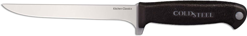 The illustrated Cold Steel Knife is the Kitchen Classics Cold Steel Boning Knife that features a 6" blade made of German 4116 stainless steel, 2mm thick. The handle of this Cold Steel Knife has a sturdy Zy-Ex core and a textured Kray-Ex overlay for secure, non slip grip. The Cold Steel Boning Knife has an overall length of 10 7/8", and it weighs 2.6 ounces.