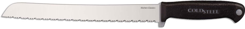 The illustrated Cold Steel Knife is the Kitchen Classics Cold Steel Bread Knife that features a 9" serrated blade made of German 4116 stainless steel, 1.5mm thick. The handle of this Cold Steel Knife has a sturdy Zy-Ex core and a textured Kray-Ex overlay for secure, non slip grip. The Cold Steel Bread Knife has an overall length of 13 7/8", and it weighs 3.4 ounces.