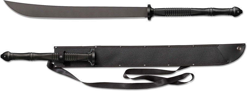 The illustrated Cold Steel Machete is the Cold Steel Thai Machete that features a 22" blade made of 1055 carbon steel, 2.8mm thick. The blade of this Cold Steel Machete has a black baked on anti rust matte finish. The 14 1/2" long black Polypropylene handle is textured for secure grip. A black Cor-Ex sheath with snap closure is included with this Cold Steel Machete. The Cold Steel Thai Machete has an overall length of 36 1/2", and it weighs 29.4 ounces.