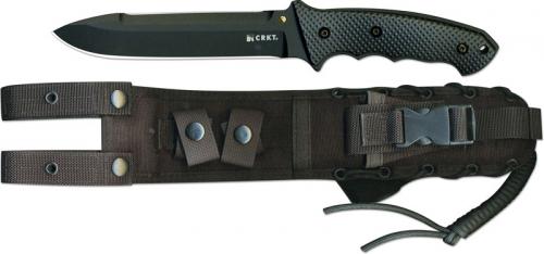 The illustrated CRKT knife is the CRKT Elishewitz F.T.W.S. Knife, designed by custom knifemaker Allen Elishewitz. The CRKT Elishewitz F.T.W.S. (For Those Who Serve) features a 6.30" modified spear point blade made of SK5 carbon steel, .23" thick, with a Rockwell hardness of 57-58. The blade of this CRKT knife has a non reflective black powder coat, and a four inch long chisel ground area on the spine for heavy duty chopping tasks. The Elishewitz F.T.W.S. Knife has full tapered tang construction; finger grooved black Zytel scales with pyramid texturing and parrot beak pommel for secure grip, and a lanyard hole. A MOLLE compatible custom black Cordura/Zytel sheath with injection molded liner and utility pocket is included with this CRKT knife. The sheath has adjustable dual belt loops, ample grommets with 550 paracord, an adjustable leg strap, and two security handle straps that qualify the system as jump and water operation accepted. The CRKT Elishewitz F.T.W.S. Knife has an overall length of 11.63" and weighs 10.8 ounces.