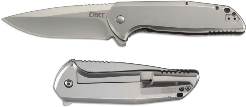 The illustrated CRKT Knife is the CRKT G.S.D. Knife, designed by Liong Mah, that features a 3.31" drop point blade made of AUS8 stainless steel, .120" thick, with a Rockwell hardness of 57-59. The hollow ground blade of this CRKT knife has a satin finish, a notched thumb rest for secure grip, a flipper and the IKBS system for ambidextrous one hand opening. The sleek stainless steel handle, 4.33" closed, has a frame lock and a lanyard hole. A side to side reversible steel pocket clip is mounted at the butt end of this CRKT Knife. The G.S.D. Knife has an overall open length of 7.69", and it weighs 5.8 ounces.