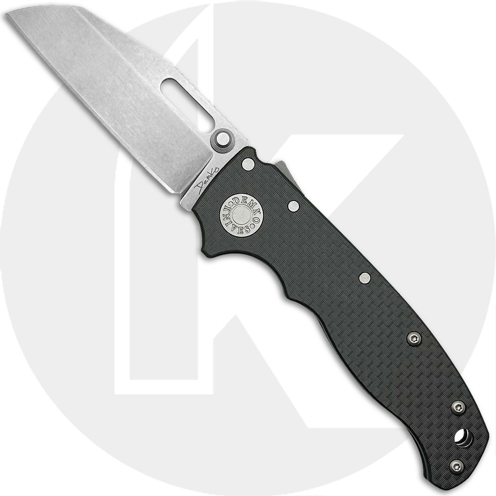 The Demko AD20.5 Knife is an innovative EDC, designed by Andrew Demko, that features his patented Shark-Lock. This AD20.5 has a 3.25 inch Shark Foot (sheepfoot) blade made of CPM S35VN stainless steel, .13 inches thick, with a 3 inch cutting edge, a stonewash finish, jimped thumb rest for precise control, an oval hole and dual thumb studs for ambidextrous one hand opening. The carbon fiber handle, 4.50 inches closed, has a caged ball bearing pivot for smooth action, steel liners for strength, the patented Shark-Lock, a lanyard hole and a removable steel pocket clip mounted at the butt end (a pocket clip for left hand carry is included). This Demko AD20.5 Knife has an overall open length of 7.625 inches, and it weighs 3.7 ounces. Made in Taiwan.