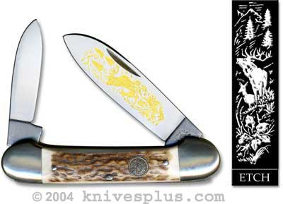 The Eye Brand Canoe Knife with Stag Handle features: Hammer Forged Solingen German carbon steel long spear and small pen blades, with Stag etch on the main blade; and genuine Stag handle, 3 5/8" closed, with nickel silver bolsters, shield, and brass liners. Eye Brand knives may not come in boxes. All Stag handles will vary in color, which is part of the uniqueness of natural handle materials.