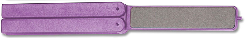 EZE-LAP EZE-Fold Diamond Sharpener is a compact, portable diamond sharpener. Great for the glove box, backpack, or kitchen drawer. The EZE-Fold diamond sharpener has plastic wings that rotate open to form the handle, and rotate closed to protect the diamond surface. The sharpening area measures 3/4" wide by 4" long; the model illustrated is Medium 400 grit with purple handle.