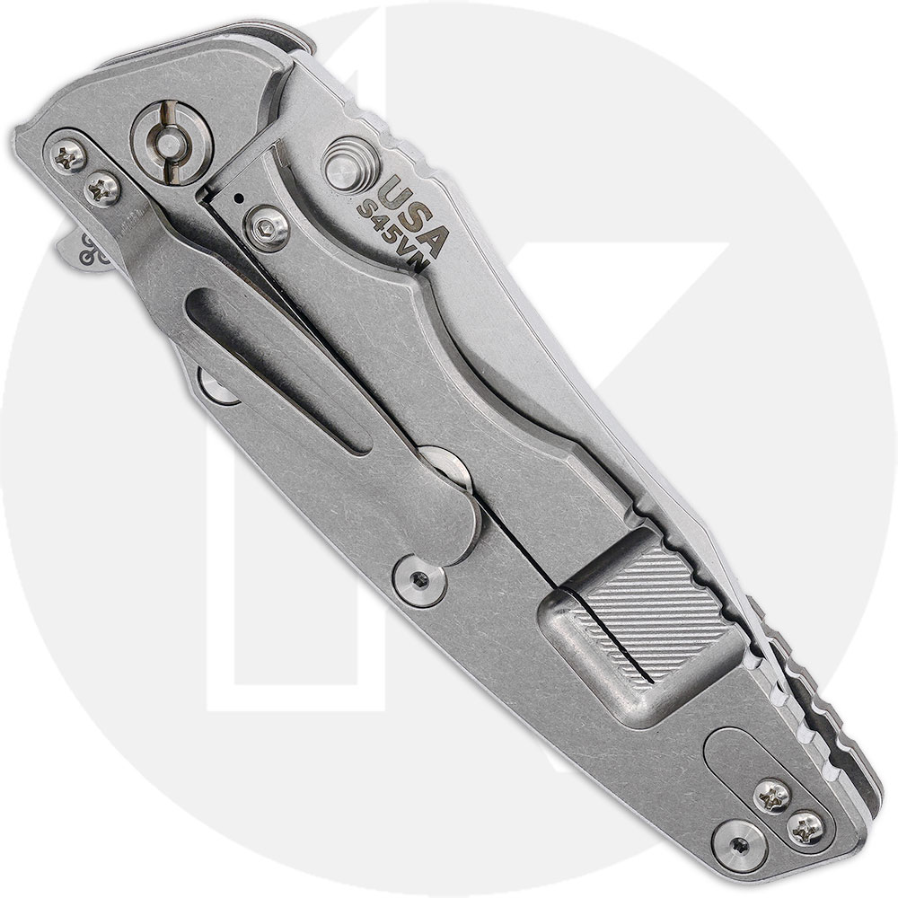 This Hinderer Eklipse Folder, designed by Rick Hinderer and manufactured by Hinderer Knives, features a 3.5-inch slicer blade made of CPM S45VN stainless steel, .165-inch thick, with the Hinderer stonewash finish. The blade has a notched thumb rest for secure purchase, a press fit 1/4-inch diameter ambidextrous thumb stud (that locks up against the frame for superior strength against sideways torque) and a flipper for one hand opening. The ergonomic handle, 4.75-inches closed, has the innovative Tri-Way Pivot System that enables the end user to switch between nylon teflon, phosphorus bronze and ball bearing pivot as needed or preferred. This Eklipse has a non lock side titanium liner with a textured FDE G10 scale for secure grip, a stonewash finish CNC machined 6AL4V titanium back with frame lock and Hinderer Lockbar Stabilizer, open frame construction with large standoffs for strength and ease of cleaning, and an end to end reversible pocket clip. The Hinderer Eklipse 3.5-Inch Folder has an overall open length of 8.25-inches, and it weighs 5.4 ounces. Proudly made in the USA.