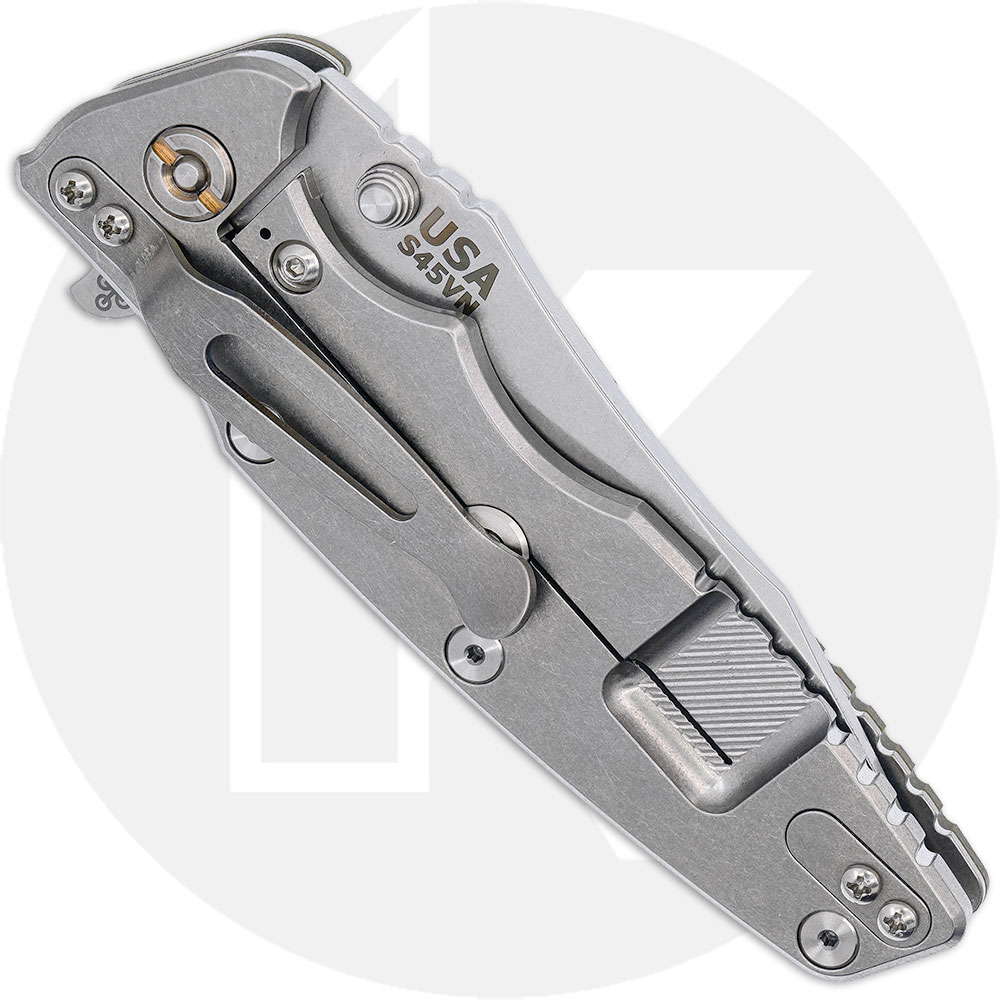 This Hinderer Eklipse Folder, designed by Rick Hinderer and manufactured by Hinderer Knives, features a 3.5-inch slicer blade made of CPM S45VN stainless steel, .165 inch thick, with a hollow grind and the Hinderer stonewash finish. The blade has a notched thumb rest for secure purchase, a press fit 1/4-inch diameter ambidextrous thumb stud (that locks up against the frame for superior strength against sideways torque) and a flipper for one hand opening. The ergonomic handle, 4.75-inches closed, has the innovative Tri-Way Pivot System that enables the end user to switch between nylon teflon, phosphorus bronze and ball bearing pivot as needed or preferred. This Eklipse has a non lock side titanium liner with a textured OD green G10 scale for secure grip, a stonewash finish CNC machined 6AL4V titanium back with frame lock and Hinderer Lockbar Stabilizer, open frame construction with large standoffs for strength and ease of cleaning, and an end to end reversible pocket clip. The Hinderer Eklipse 3.5-Inch Folder has an overall open length of 8.25-inches, and it weighs 5.4 ounces. Proudly made in the USA.