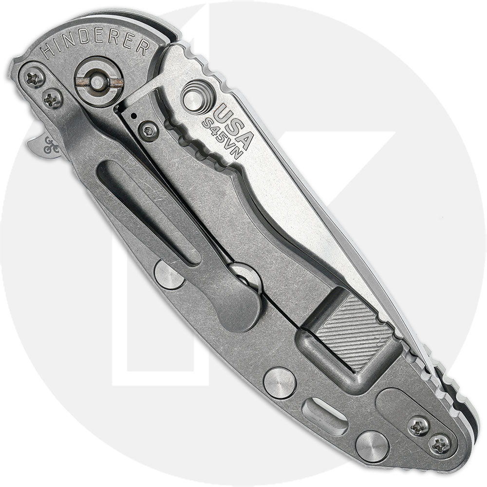 This Hinderer XM-18 3.25 Inch features a 3.25-inch spear point blade made of premium S45VN stainless steel, .165-inch thick, with a Stonewash Finish, a notched thumb rest for secure purchase, a press fit ambidextrous thumb stud that locks up against the frame for superior strength against sideways torque, and a flipper for fast opening. The ergonomic handle, 4.5-inches closed, has the innovative Tri-Way Pivot System that enables the end user to switch between nylon teflon, phosphorus bronze and ball bearing pivot as needed or preferred. This XM-18 3.25 has a non lock side with titanium liner and textured translucent green G10 scale for secure grip, CNC machined 6AL4V titanium back with a stonewashed finish, sturdy frame lock and Hinderer Lockbar Stabilizer, open frame construction with large standoffs for strength and ease of cleaning, a lanyard hole and an end to end reversible pocket clip. The Hinderer XM-18 3.25 Inch spear point has an overall open length of 7.5-inches, and it weighs 4.8 ounces. Proudly made in the USA.