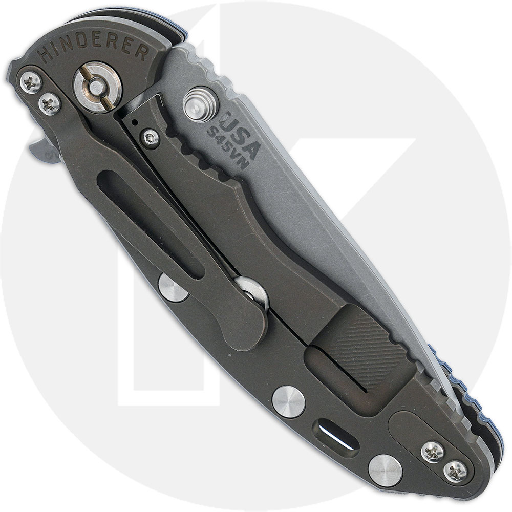 This Hinderer XM-18 3.25 Inch features a 3.25-inch spear point blade made of premium S45VN stainless steel, .165-inch thick, with a Working Finish, a notched thumb rest for secure purchase, a press fit ambidextrous thumb stud that locks up against the frame for superior strength against sideways torque, and a flipper for fast opening. The ergonomic handle, 4.5-inches closed, has the innovative Tri-Way Pivot System that enables the end user to switch between nylon teflon, phosphorus bronze and ball bearing pivot as needed or preferred. This XM-18 3.25 has a non lock side with titanium liner and textured blue/black G10 scale for secure grip, CNC machined 6AL4V titanium back with a Battle Bronze finish, sturdy frame lock and Hinderer Lockbar Stabilizer, open frame construction with large standoffs for strength and ease of cleaning, a lanyard hole and an end to end reversible pocket clip. The Hinderer XM-18 3.25 Inch spear point has an overall open length of 7.5-inches, and it weighs 4.8 ounces. Proudly made in the USA.