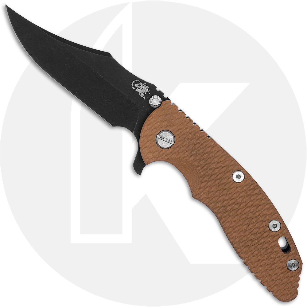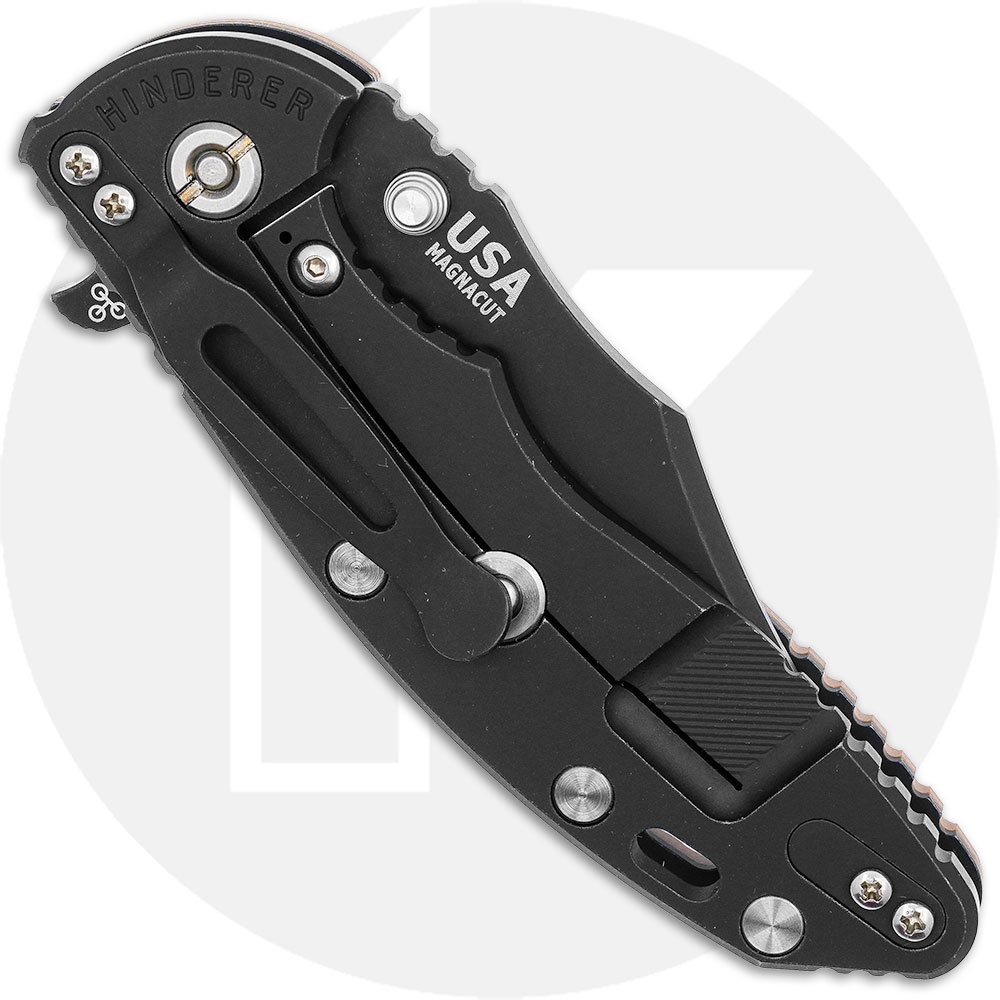 This Hinderer XM-18 3.5-Inch features a 3.5-inch bowie blade made of premium CPM MagnaCut stainless steel, .165-inch thick, with a Battle Black finish, a notched thumb rest for secure purchase, a press fit ambidextrous thumb stud that locks up against the frame for superior strength against sideways torque, and a flipper for fast opening. The ergonomic handle, 4.75-inches closed, has the innovative Tri-Way Pivot System that enables the end user to switch between nylon teflon, phosphorus bronze and ball bearing pivot as needed or preferred. This XM-18 3.5 has a non lock side with titanium liner and textured coyote G10 scale for secure grip, CNC machined Battle Black 6AL4V titanium back with sturdy frame lock and Hinderer Lockbar Stabilizer, open frame construction with large standoffs for strength and ease of cleaning, a lanyard hole and an end to end reversible pocket clip. The Hinderer XM-18 3.5 Inch Bowie has an overall open length of 8.25-inches, and it weighs 5.6 ounces. Proudly made in the USA.