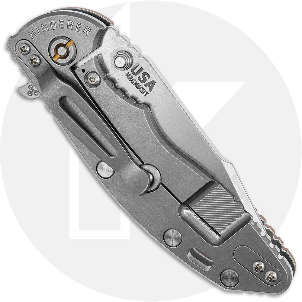 This XM-18 3.5 Inch features a 3.5-inch harpoon spanto blade made of MagnaCut stainless steel, .165-inch thick, with a stonewash finish, a notched thumb rest for secure purchase, a press fit ambidextrous thumb stud that locks up against the frame for superior strength against sideways torque, and a flipper for fast opening. The ergonomic handle, 4.75-inches closed, has the innovative Tri-Way Pivot System that enables the end user to switch between nylon teflon, phosphorus bronze and ball bearing pivot as needed or preferred. The XM-18 3.5 has a non lock side with titanium liner and textured coyote G10 scale for secure grip, CNC machined stonewash finish 6AL4V titanium back with sturdy frame lock and Hinderer Lockbar Stabilizer, open frame construction with large standoffs for strength and ease of cleaning, a lanyard hole and an end to end reversible pocket clip. The Hinderer XM-18 3.5 Inch Harpoon Spanto model has an overall open length of 8.25-inches, and it weighs 5.6 ounces. Proudly made in the USA.
