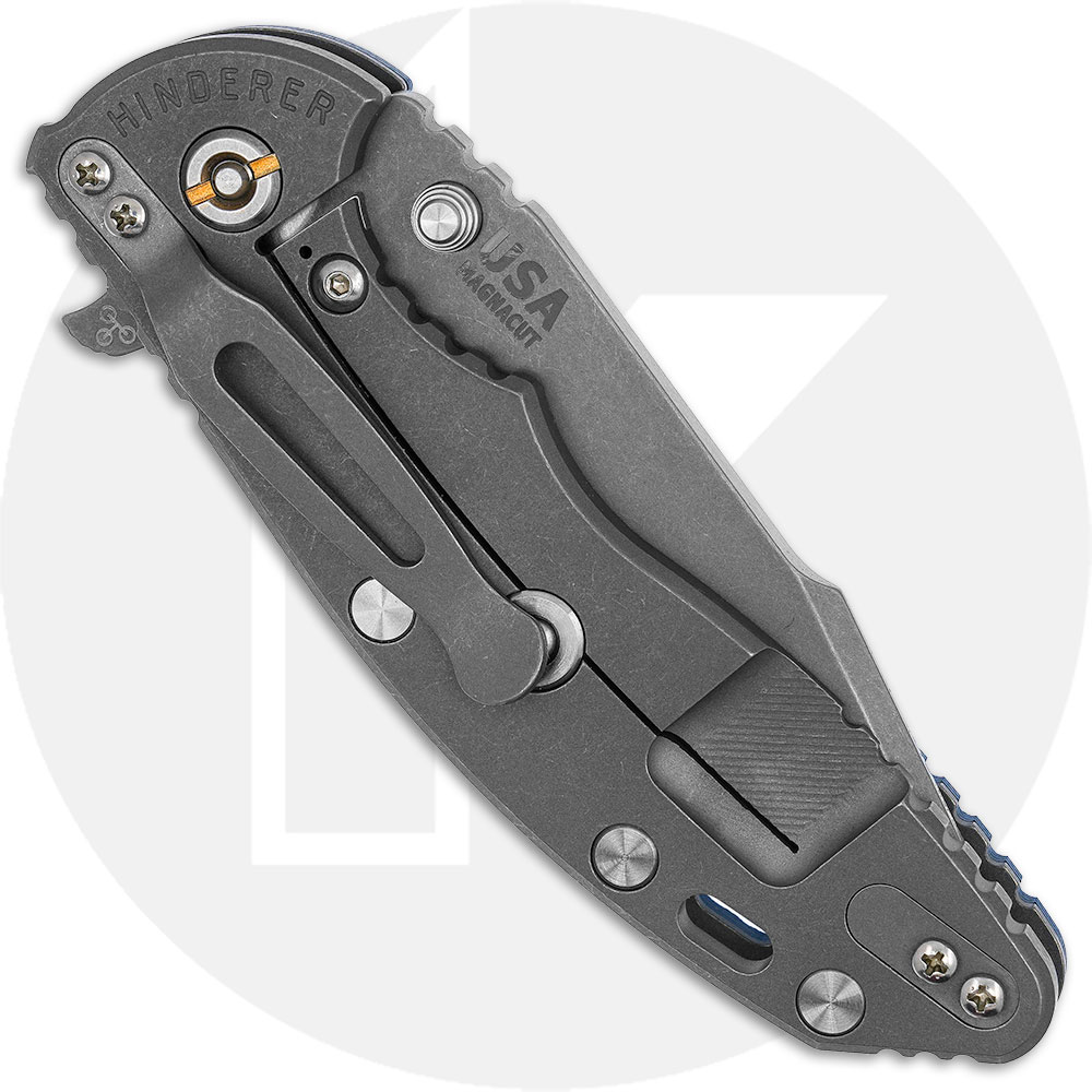 This XM-18 3.5 Inch features a 3.5-inch harpoon spanto blade made of MagnaCut stainless steel, .165-inch thick, with a working finish, a notched thumb rest for secure purchase, a press fit ambidextrous thumb stud that locks up against the frame for superior strength against sideways torque, and a flipper for fast opening. The ergonomic handle, 4.75-inches closed, has the innovative Tri-Way Pivot System that enables the end user to switch between nylon teflon, phosphorus bronze and ball bearing pivot as needed or preferred. The XM-18 3.5 has a non lock side with titanium liner and textured blue/black G10 scale for secure grip, CNC machined working finish 6AL4V titanium back with sturdy frame lock and Hinderer Lockbar Stabilizer, open frame construction with large standoffs for strength and ease of cleaning, a lanyard hole and an end to end reversible pocket clip. The Hinderer XM-18 3.5 Inch Harpoon Spanto model has an overall open length of 8.25-inches, and it weighs 5.6 ounces. Proudly made in the USA.