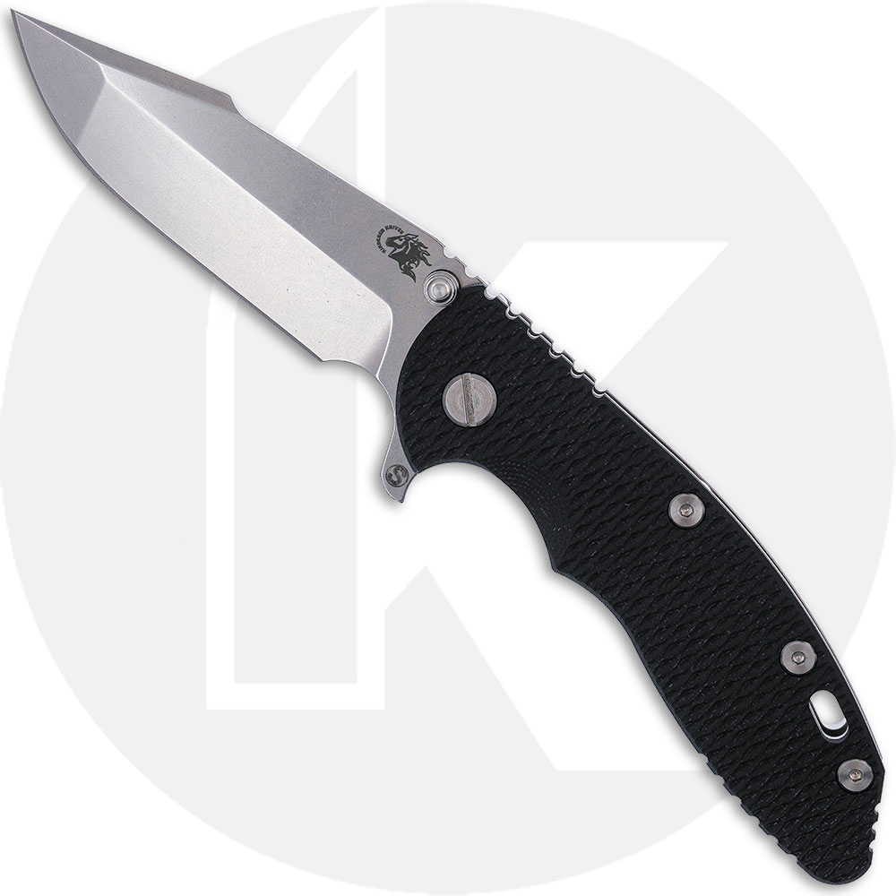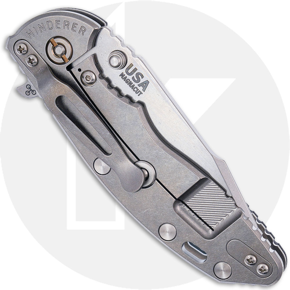 This XM-18 3.5 Inch features a 3.5-inch skinny harpoon spanto blade made of MagnaCut stainless steel, .140-inch thick, with a stonewash finish, a notched thumb rest for secure purchase, a press fit ambidextrous thumb stud that locks up against the frame for superior strength against sideways torque, and a flipper for fast opening. The ergonomic handle, 4.75-inches closed, has the innovative Tri-Way Pivot System that enables the end user to switch between nylon teflon, phosphorus bronze and ball bearing pivot as needed or preferred. The XM-18 3.5 has a non lock side with titanium liner and textured black G10 scale for secure grip, CNC machined stonewashed 6AL4V titanium back with sturdy frame lock and Hinderer Lockbar Stabilizer, open frame construction with large standoffs for strength and ease of cleaning, a lanyard hole and an end to end reversible pocket clip. The Hinderer XM-18 3.5 Inch Skinny Harpoon Spanto model has an overall open length of 8.25-inches, and it weighs 5 ounces. Proudly made in the USA.