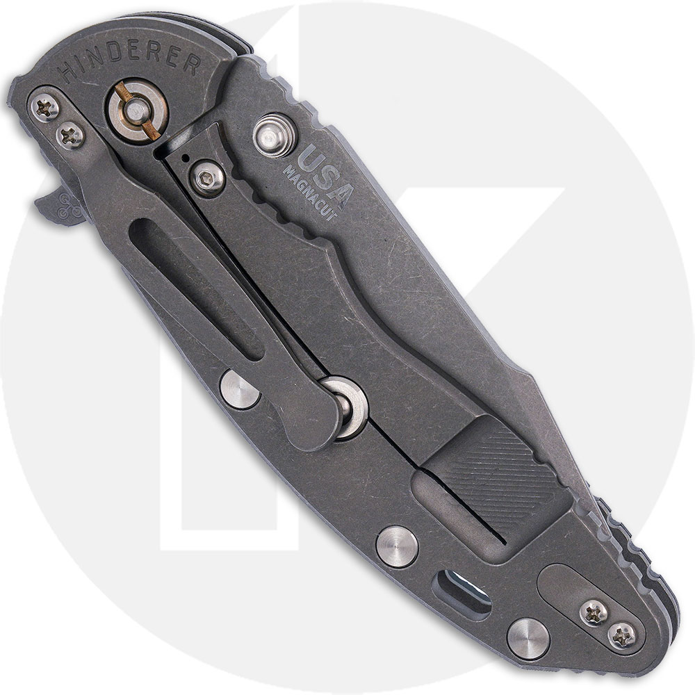 This XM-18 3.5 Inch features a 3.5-inch skinny harpoon spanto blade made of MagnaCut stainless steel, .140-inch thick, with a working finish, a notched thumb rest for secure purchase, a press fit ambidextrous thumb stud that locks up against the frame for superior strength against sideways torque, and a flipper for fast opening. The ergonomic handle, 4.75-inches closed, has the innovative Tri-Way Pivot System that enables the end user to switch between nylon teflon, phosphorus bronze and ball bearing pivot as needed or preferred. The XM-18 3.5 has a non lock side with titanium liner and textured blue/black G10 scale for secure grip, CNC machined working finish 6AL4V titanium back with sturdy frame lock and Hinderer Lockbar Stabilizer, open frame construction with large standoffs for strength and ease of cleaning, a lanyard hole and an end to end reversible pocket clip. The Hinderer XM-18 3.5 Inch Skinny Harpoon Spanto model has an overall open length of 8.25-inches, and it weighs 5 ounces. Proudly made in the USA.