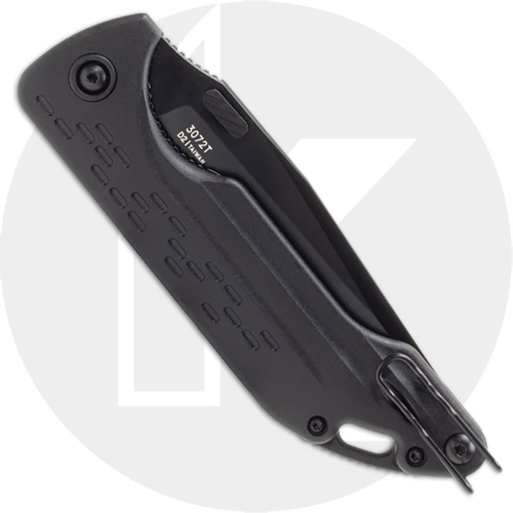 The illustrated KABAR knife is the KABAR Warthog Folder that features a 3.75-inches clip point blade made of D2 tool steel, .157-inch thick, with a Rockwell hardness of 57-59. The blade of this KABAR knife has a black coating, a notched thumb ramp, and dual thumb studs for ambidextrous one hand opening. The grooved black GFN handle, 5-inches closed, has texture notches and a finger groove for secure grip, a liner lock, and a side-to-side reversible pocket clip mounted at the pivot end of this KABAR knife. The KA-BAR Warthog Folder has an overall length of 8.75-inches, and it weighs 4 ounces. Made in Taiwan.
