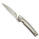 The illustrated Kizer Knife is the Kizer Rogue Knife, made in collaboration with Dirk Pinkerton, that features a 3.0" modified Wharncliffe blade made of CPM S35VN stainless steel. The blade of this Kizer Knife has a flat grind, a stonewash finish, a notched thumb rest for secure grip, and dual thumb studs for ambidextrous one hand opening. The matte silver titanium handle, 4.14" closed, has milled grooves for secure purchase, bearing pivot system for smooth opening, and a frame lock. A removable blue titanium pocket clip is mounted at the butt end of this Kizer Knife. The Kizer Rogue Knife has an overall open length of 7.14". Imported from China.