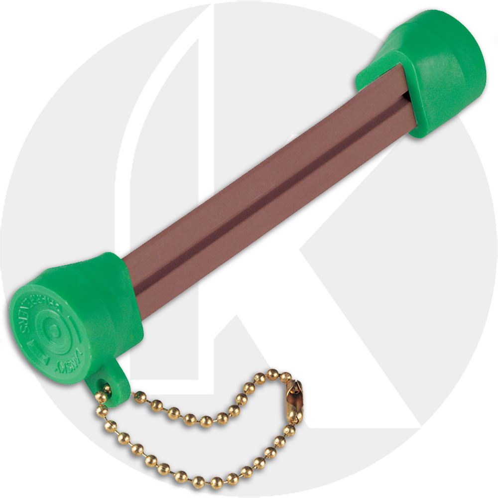 Lansky Pocket Sized Crock Stick Knife Sharpeners offer the knife sharpening ability of alumina ceramic in a convenient key chain sized package. The Crock Stick Multi-Sharpener is a versatile super compact knife sharpener. The triangular shape of the alumina ceramic rod is just right for putting an edge on straight edge knives, serrated edge knives, and pointed objects. Use the flat areas for straight edges, use the corners for serrations, and use the groove for pointed objects! This handy little knife sharpener has colorful guide guards to help protect from breakage (color may vary from illustration), and a handy key chain attachment.