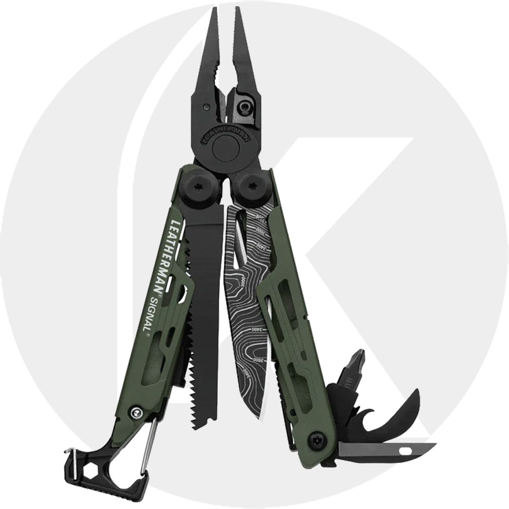 Experience the perfect outdoor companion with The Signal by Leatherman, where traditional tools seamlessly merge with contemporary preparedness. Boasting all locking tools, replaceable premium wire cutters, a convenient one-hand operation combo blade, and features like a diamond-coated sharpener, ferro rod, and emergency whistle, it's the ideal tool for any adventure. The black oxide tools, topographic etching on the main blade, and Green Cerakote coated handles add a stylish touch to this versatile multi-tool.