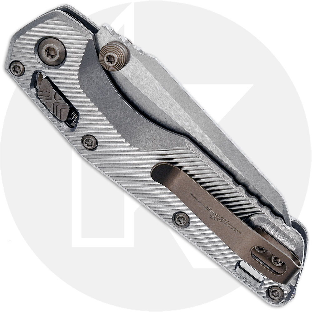 Introducing the Microtech Standard Issue (MSI) Mini. This folder features a part serrated 3.2-inch stonweash sheepsfoot blade crafted from Microtech's exclusive Bohler M390MK stainless steel, paired with a 4.25-inch stonewash finish fluted titanium handle. The blade ensures superior edge retention and precision cutting, while the handle provides excellent, ergonomic grip in any weather condition. Equipped with RAM-LOK for secure blade lock-up, steel liners, a flamed titanium backspacer with a lanyard hole, bronzed double vapor blast stainless hardware, a reversible pocket clip, and a thumb hole for easy opening, the MSI offers outstanding strength and ambidextrous functionality. Weighing 4.3 ounces, this rugged knife is well-suited for any cutting task. Proudly made in the USA.