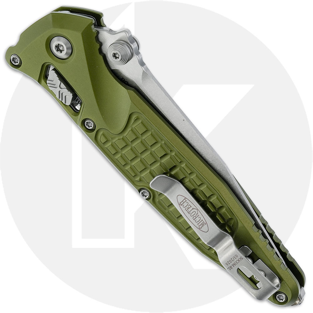 Introducing the Microtech Socom RAM-LOK™. This model features a spear point blade, 3.8-inches, has a stonewash finish and dual thumb studs for easy, ambidextrous opening. The handle, 5-inches, is made of OD green anodized Frag Pattern aluminum with a sturdy RAM-LOK™, side-to-side reversible deep-carry pocket clip, and a glass-breaker tip. Weighing in at 4.6 ounces, the Socom is perfect for EDC or as an addition to your collection. Made in the USA.