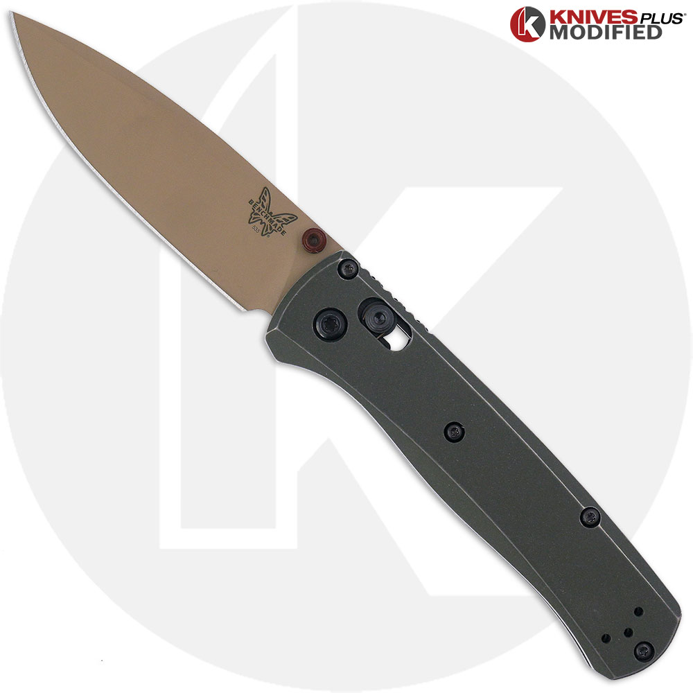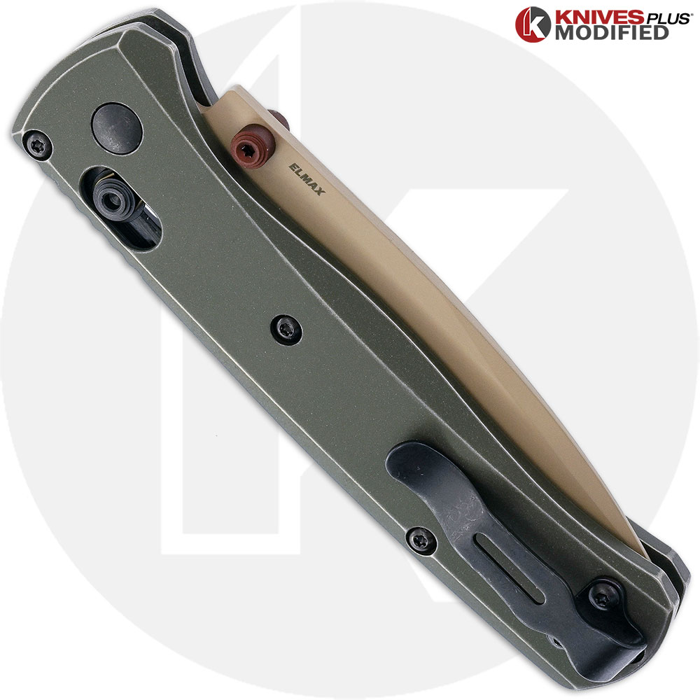 The Benchmade Bugout is a slim, lightweight everyday carry knife that is equally suitable for a pair of dress pants or a backpack. This Bugout features a 3.24-inch drop point blade made of Elmax stainless steel, .09-inch thick, with a Rockwell hardness of 58-60. The blade has a tan cerakote finish with a top swedge and dual blue thumb studs for ambidextrous one hand opening. The Taiga Green handle scales have been replaced with the KP Benchmade Bugout Titanium Scales - No Lanyard - Deep Chamfer - Custom Panzer Green Cerakote + Stonewash. The Bugout has a closed length of 4.22-inches, an ambidextrous AXIS Lock, a large lanyard hole and a side to side reversible discrete carry pocket clip mounted at the butt end. The Benchmade Bugout Knife has an overall open length of 7.46-inches, and it weighs only 2.8 ounces. Proudly made in the USA.