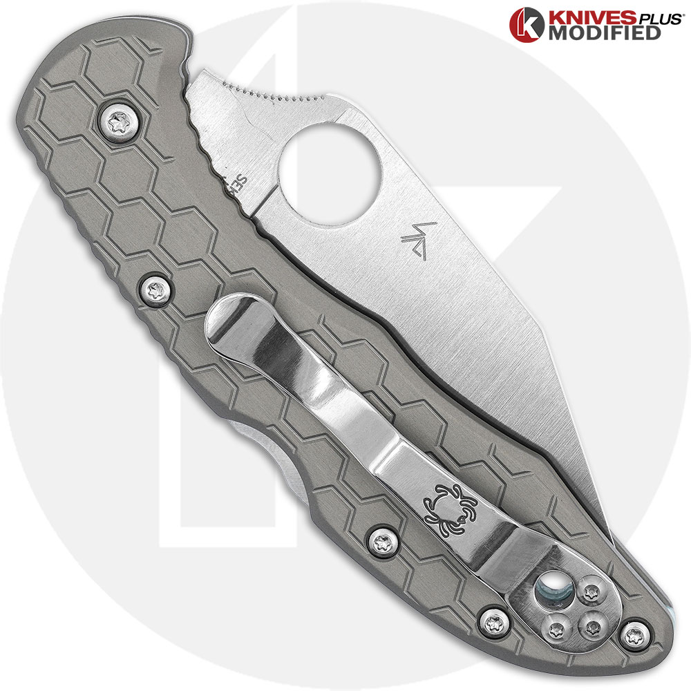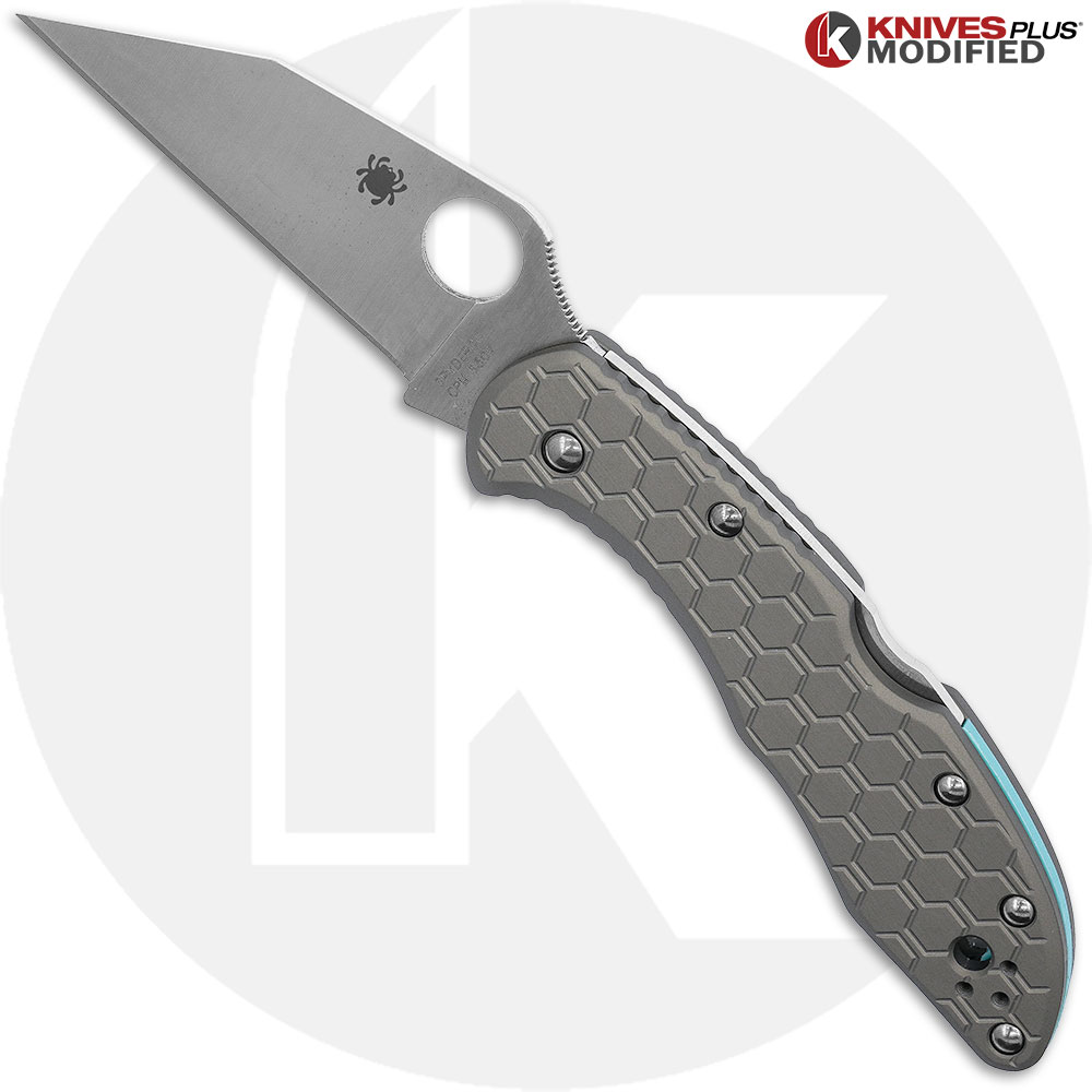 This MODIFIED Delica 4 features a reground 2.87-inch Wharncliffe blade made of CPM S30V stainless steel, .098-inch thick, with a flat grind, a notched thumb ramp for secure grip, and the Spyderco hole for ambidextrous one hand opening. The Tantalizing Teal FRN (fiberglass reinforced nylon) handle has been replaced with the AWT Delica Limited Edition Hex Pattern Scales with a Sniper Grey Anodize finish. The Delica is 4.25-inches closed with sturdy back lock and a lanyard hole. The AWT scales feature an ambi tip-up position for the steel pocket clip with 2-56 screws. The pocket clip screw holes are milled using a 2-56 tap so the original clip screws will not work with these scales. The Spyderco Delica 4 Lightweight Knife has an overall open length of 7.15 inches, and it weighs 2.63 ounces. Made in Japan.