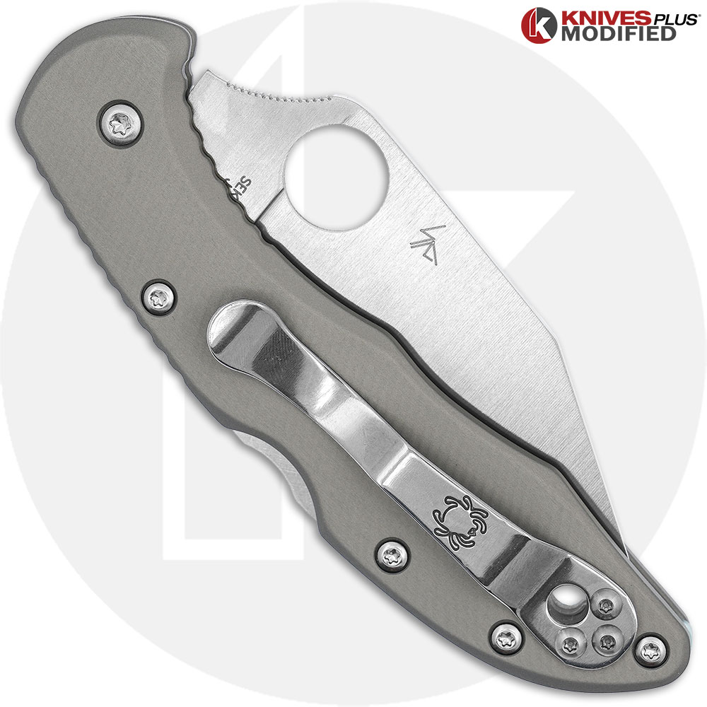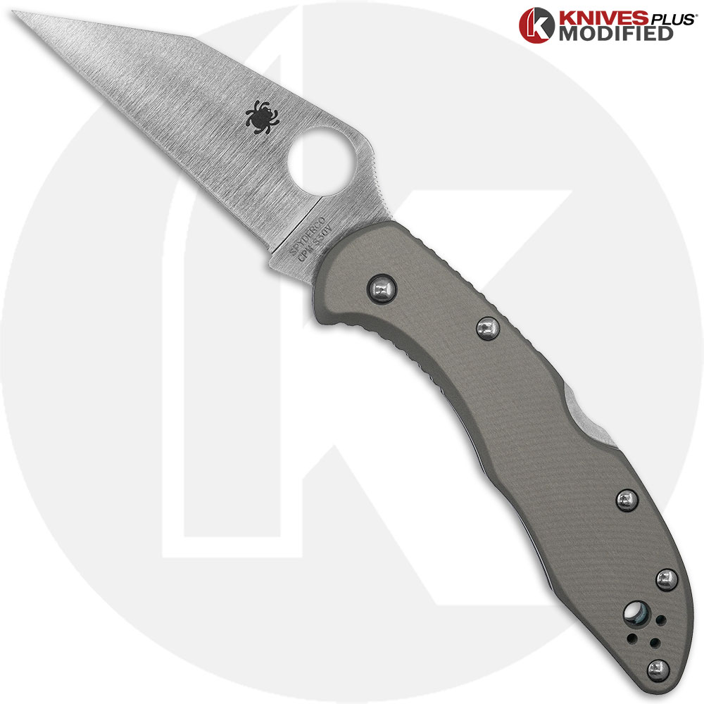 This MODIFIED Delica 4 features a reground 2.87-inch Wharncliffe blade made of CPM S30V stainless steel, .098-inch thick, with a flat grind, a notched thumb ramp for secure grip, and the Spyderco hole for ambidextrous one hand opening. The Tantalizing Teal FRN (fiberglass reinforced nylon) handle has been replaced with the AWT Delica Agent Scales with a Sniper Grey Anodize finish. The Delica is 4.25-inches closed with sturdy back lock and a lanyard hole. The AWT scales feature an ambi tip-up position for the steel pocket clip with 2-56 screws. The pocket clip screw holes are milled using a 2-56 tap so the original clip screws will not work with these scales. The Spyderco Delica 4 Lightweight Knife has an overall open length of 7.15 inches, and it weighs 2.63 ounces. Made in Japan.